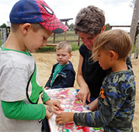 Manchmal denke ich, dass genau diese biografischen Erfahrungen mein Interesse für Sprachbildung im weitesten Sinne in der Kita geprägt und in mir den Impuls geweckt haben, selbst einmal Kinder darin zu unterstützen, sozial starke, emotional unabhängige und selbstbewusste Persönlichkeiten zu werden. Um ihnen Sprache als den wertvollen Schatz, der sie ist, nahezubringen und dabei auch ihre Selbstwirksamkeit erfahrbar zu machen, zieht sich die Sprachförderung wie ein roter Faden durch unsere tägliche Praxis und wird meist von den Kindern selbst initiiert. Zum Beispiel als mich Piet, einer unserer Zweijährigen, in meinem Büro besuchte und mit der Frage »Machst du da?« überraschte. Ich erklärte ihm, dass ich die Portfolios der Kinder mit neuen Geschichten aktualisiere und dafür unseren Fotoapparat nach Fotos für die Portfolios durchforste. Als ich ihm ein Foto zeigte, auf dem er selbst beim Spielen im Sandkasten sitzt, sagte er: »Selber tippen!«, und krabbelte auf meinen Schoß.