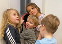 Experimentierstationen wie die mit dem Klangspiel oder auch das Geräuschememory sind intuitiv zu bedienen. Die roten Würfel sehen zwar gleich aus, sie rasseln, rascheln oder klappern aber unterschiedlich. Die Kinder interessieren sich weder dafür, wie es zu diesen Unterschieden kommt, noch dafür, ob jeweils Würfel dieselben Geräusche machen. Fragen wie diese scheinen für sie heute keine Rolle zu spielen. Ihr Interesse gilt vielmehr der Vielfalt der Geräusche, und wir ziehen es vor, ihren Flow nicht zu unterbrechen. Faszination wirkt anziehend. Deshalb bilden sich immer wieder auch größere Gruppen um bestimmte Experimentierstationen. So zum Beispiel, als die Kinder in einer Ecke des Raumes – »Hallo, hallo« – eine Stimme hören, obwohl dort niemand zu sehen ist. Irritiert schauen sie sich um. Sie rufen »Hallo, hallo« und »Wer spricht da?« Wieder ertönt die Stimme. Auch ich höre sie. Sie hat viel Hall und ertönt aus einer großen Rohröffnung in jener Ecke, in der niemand steht. Offenbar glaubt ein Kind, die Stimme zu kennen und ruft »Heißt du Müslim?« in das Rohr. Dann hören wir Sven Giese lachen, und nach und nach erkennen auch wir anderen die Situation: Der geheimnisvolle Rufer ist der Erzieher Müslim Araz. Er sitzt jedoch weit entfernt am anderen Ende des langen Rohres. Obwohl alle Kinder ihn inzwischen dort entdeckt haben, rufen manche weiter »Hallo, ist da jemand?«, »Hallo, hallo?« Es scheint, sie brauchen in diesem besonderen Fall eine Weile, um das, was sie sehen, und das, was sie hören, in Einklang zu bringen – obwohl sie, so denke ich im Nachhinein, gewohnt sind, mit Menschen zu sprechen, die weit entfernt sind. Aber eben am Handy und nicht in Sichtweite am anderen Ende eines langen Rohres.